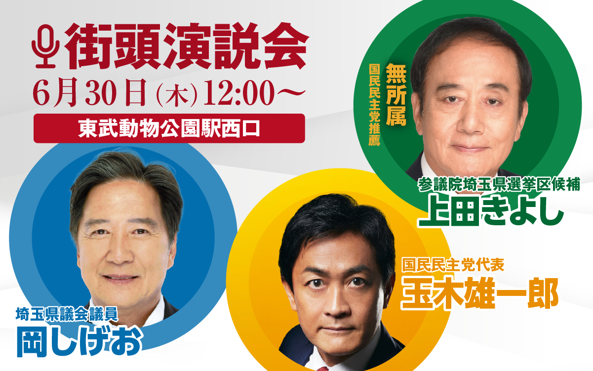 7月2日、3日の予定 7月 1, 2022 7月2日 終日駅頭 大宮駅東口 9:00~10:00 河村たかし名古屋市長 11:00~11:45 玉木雄一郎国民民主党代表 14:30~15:00 浅野さとし衆議院議員 16:00~ 個人演説会 行田市中央公民館みらい 7月3日 終日駅頭 浦和駅東口 *変更の可能性あり